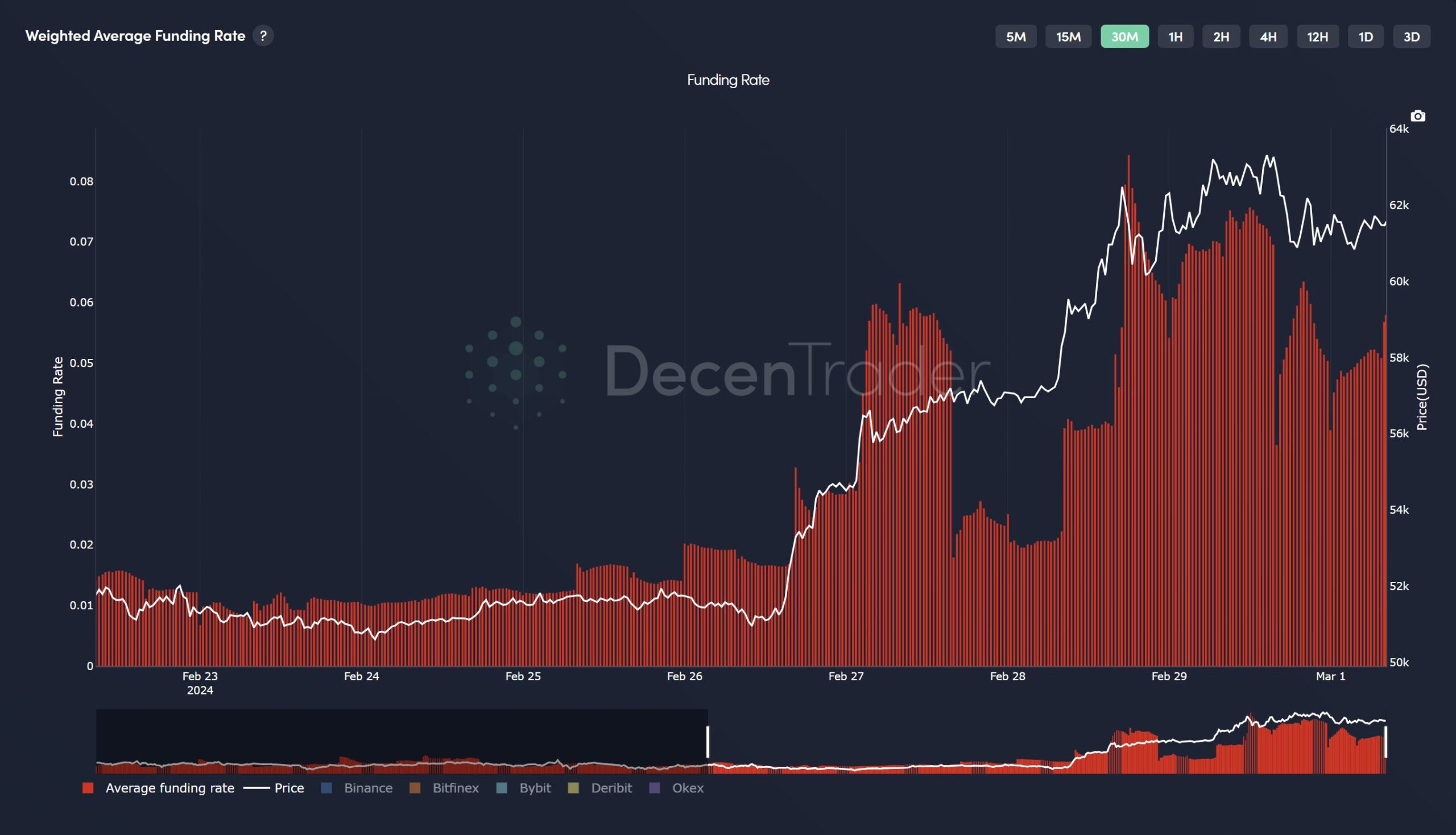 With Bitcoin pumping back up towards previous all-time-highs we are noticing that derivatives markets are heating up. Funding rates have climbed significantly higher over the past couple of days as news of Bitcoin’s price action spreads.