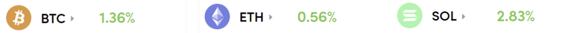 Ethereum is up 0.56% in the past 24hrs, while Solana has bounced a little more after falling harder over the weekend. It is up 2.83% vs. 24 hours ago.