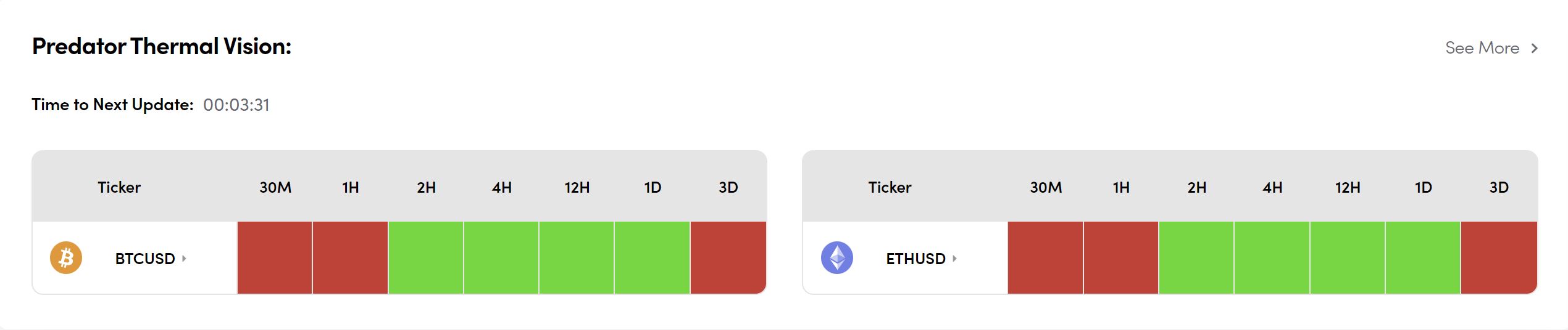 Ethereum Predator Thermal Vision is currently matching Bitcoin, bullish on medium term timeframes, though the 3-day remains red indicating that the longer-term trend remains bearish for now.