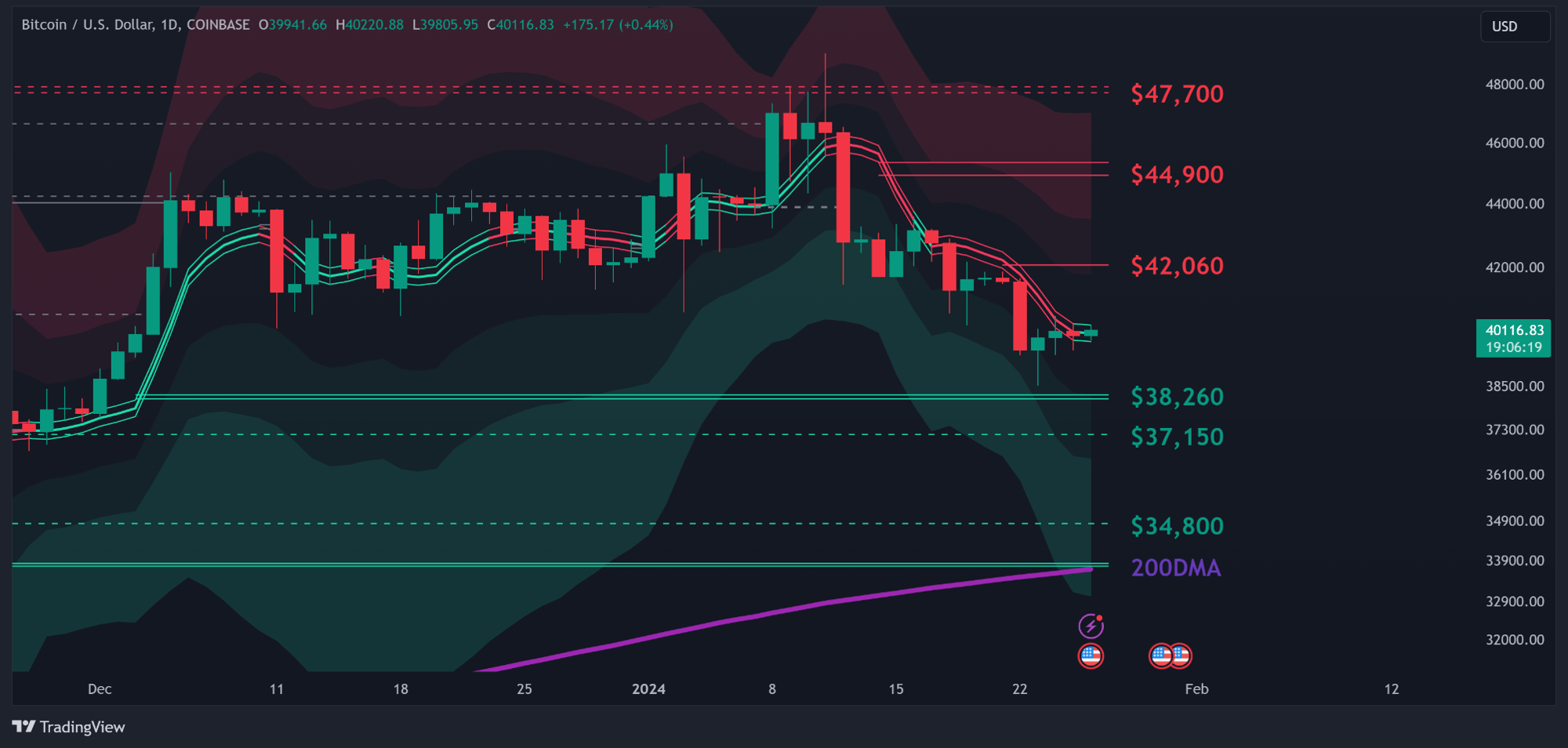 Bitcoin has trended back up to the Sniper mean reversion line. Near-term resistance is up at $42,060 while support below is at $38,260 and $37,150 levels.