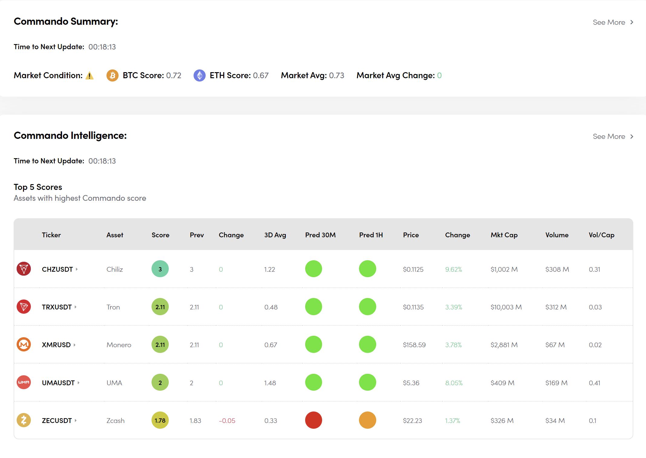 Chiliz (CHZUSD) is the top scorer with a Commando score of 3 and it is bullish on both Predator 30M and 1H timeframes.