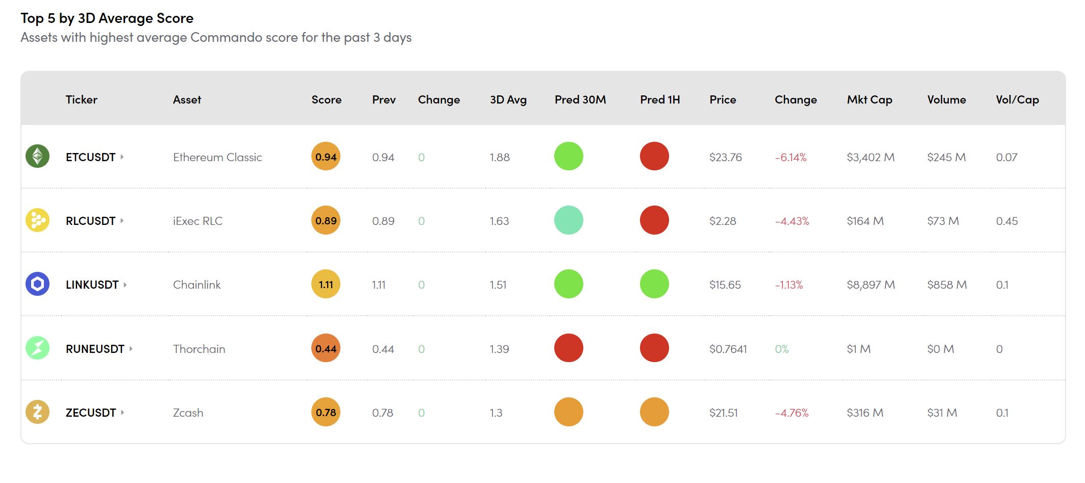 The relative current market weakness is highlighted by the 3 day average score of Commando. None of the top scorers even have a score above 1 at this time. Ethereum Classic (ETC) is the top scorer over the past 3 days with a Commando score of just 0.94.