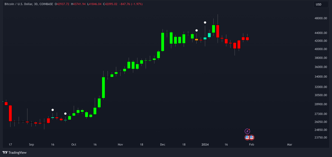 The 3 Day Predator chart is red on the current candle. This has been the case since the Bitcoin ETF announcement.