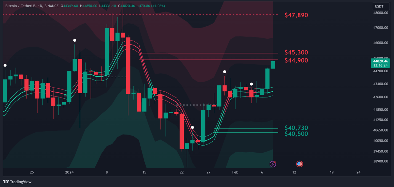 Using the Decentrader Sniper tool, $BTC has now trended up over the past few days towards key resistance levels of $44,900 and $45,300.