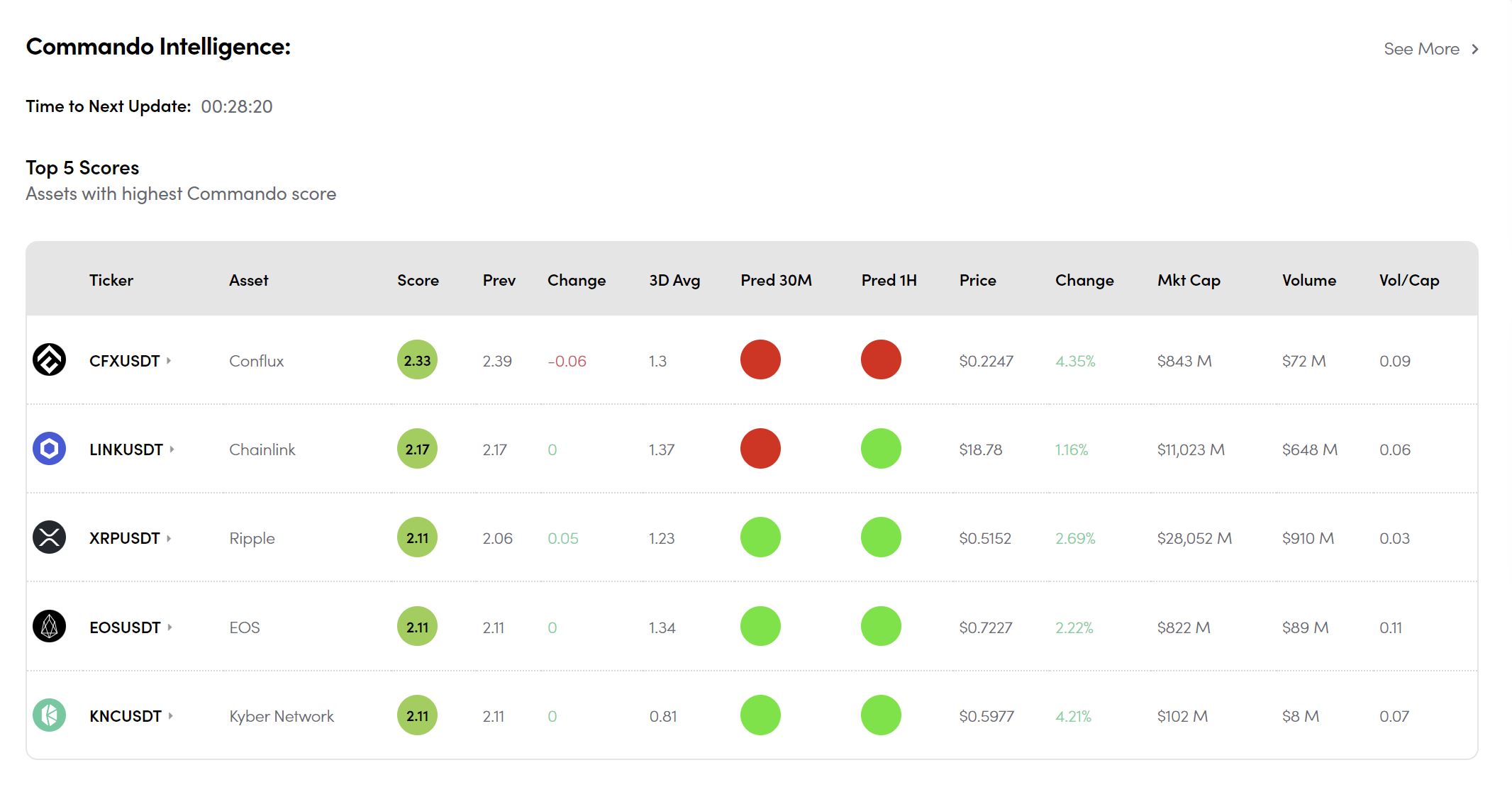 Ripple (XRP), EOS (EOS), and Kyber Network (KNC) all scoring 2.11 and are green on Predator 30M and 1hr timeframes.